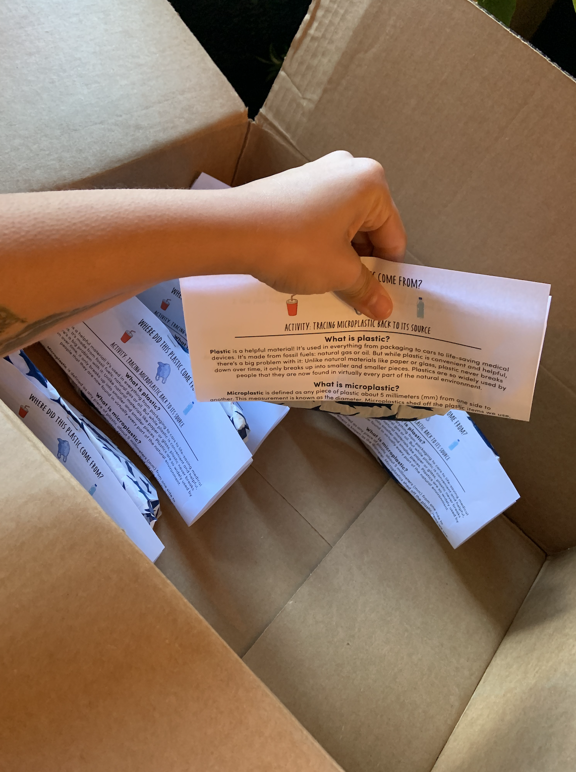 My whole goal is to show the students how the plastic things we use every day, especially those things classified as “single-use plastic”—namely, packaging we use for mere moments before throwing it away—break up into microscopic particles that pose risks to human and ecological health. These little particles are called microplastic, and they completely permeate our world. They are in our indoor and outdoor air, freshwater, oceans, food and soil. They are inside wild animals and they are inside of us humans too. Research suggests the chemicals in these plastic bits are making all of us sicker than we should be. Our hormones no longer function normally, cancer rates have skyrocketed, and we now suffer an increased rate of all sorts of other issues—mental health, autoimmune, reproductive and otherwise—that could be linked to the chemicals in plastic.