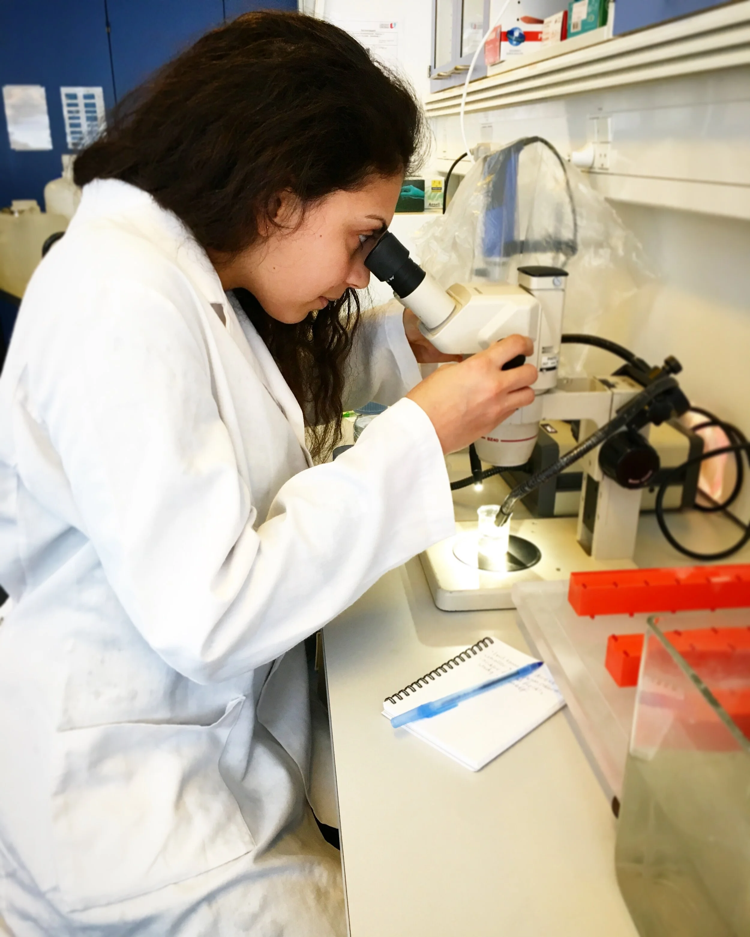 The author in a lab in Denmark, studying microplastic up close. Photo courtesy: Erica Cirino