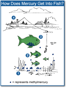 Accumulation of mercury and its more dangerous form, methylmercury, through the food chain results in high concentrations of mercury in larger animals.