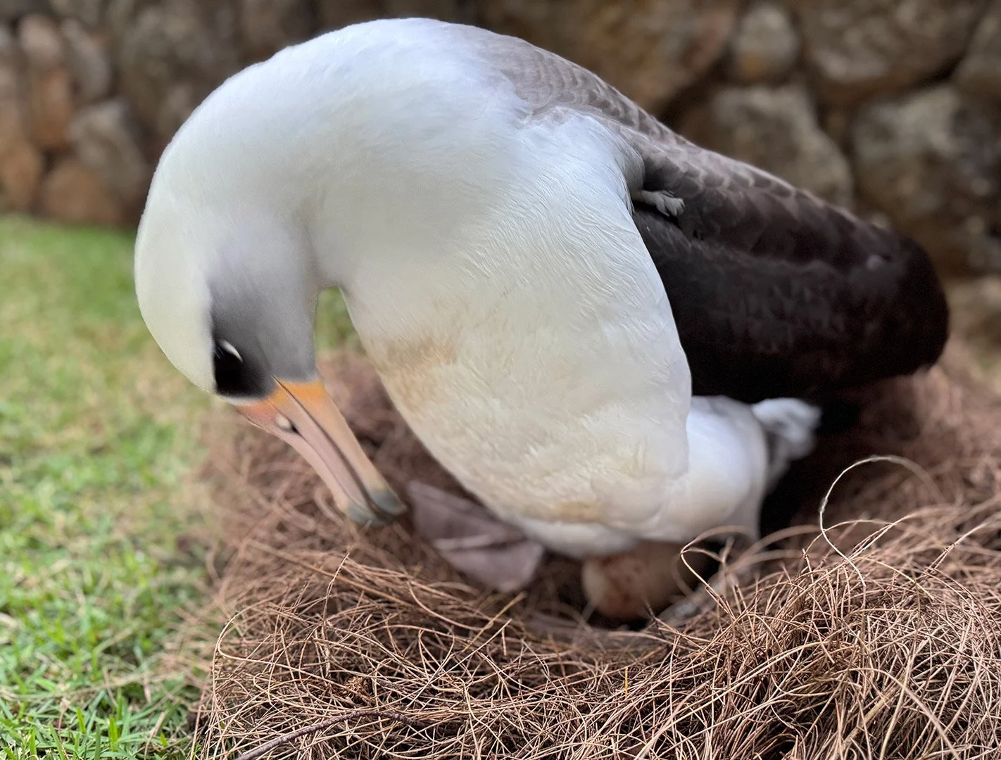 Kalama is the first two-mom mōlī starlet of Kauaʻi. Other than Mango, her lifecycle has been visible to the viewing public longer than any other Laysan albatross. She hatched in 2017 in view of the TrossCam and was livestreamed twenty-four hours a day until several months later when she moved off camera to fledge from a nearby bluff. Kalama came from a translocated egg from the Pacific Missile Range Facility where nests are discouraged due to the danger of bird-aircraft collisions. She was raised by two adoptive moms. We produced a Telly Award-winning short documentary about those first six months of her life. Once Kalama fledged, we did not see her again until 2022. In HY2024 she became the youngest nester in her colony, but that egg broke soon after being laid. This year (HY2025) we have confirmed her mate (ʻEleu), and together they have chosen a better (shadier, softer) nest site. Their egg has officially been deemed fertile.