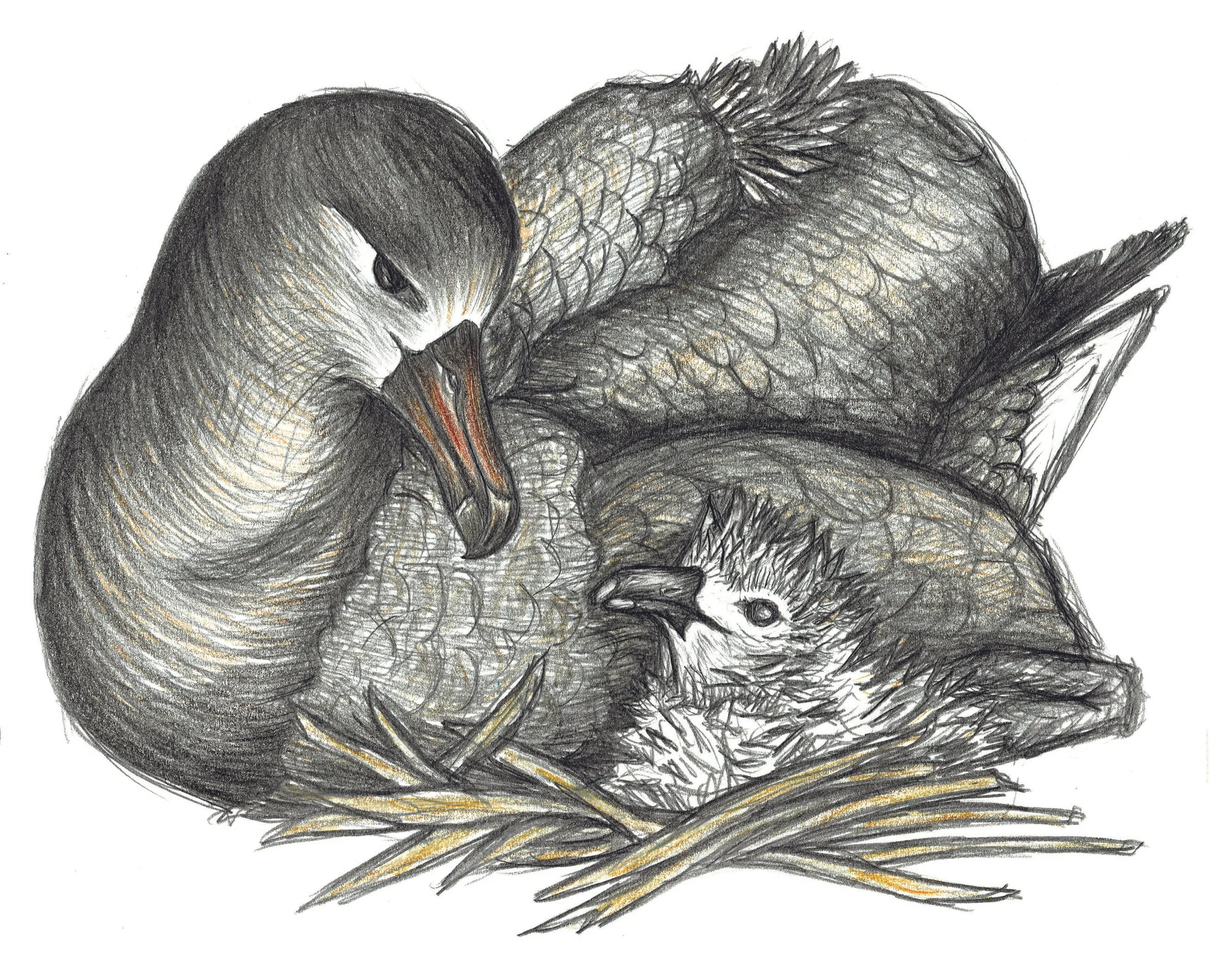 It was after reading Carl Safina’s book Eye of the Albatross that I first became obsessed with mōlī. I wanted to find a way to experience them in person and was able to volunteer with the US Fish and Wildlife Service on Midway Atoll, where most of the world’s Laysan albatross nest, not to mention many black-footed albatross and a few short-tailed albatross as well. I created a piece of art for USFWS which told the story of Midway Atoll, and it was used to raise funds for conservation projects there. I also participated in the albatross census. That year we counted over 550,000 active albatross nests. Being among millions of wild birds deeply affected me, and learning more about the challenges they face made me want to help them. With Cornell Lab Publishing Group I wrote and illustrated A Perfect Day for an Albatross for young people. I ended up returning several times to Midway to volunteer with the count, and I now help lead the census on alternating years. I would say that all of my work and interest in trying to help wildlife has grown from that experience.