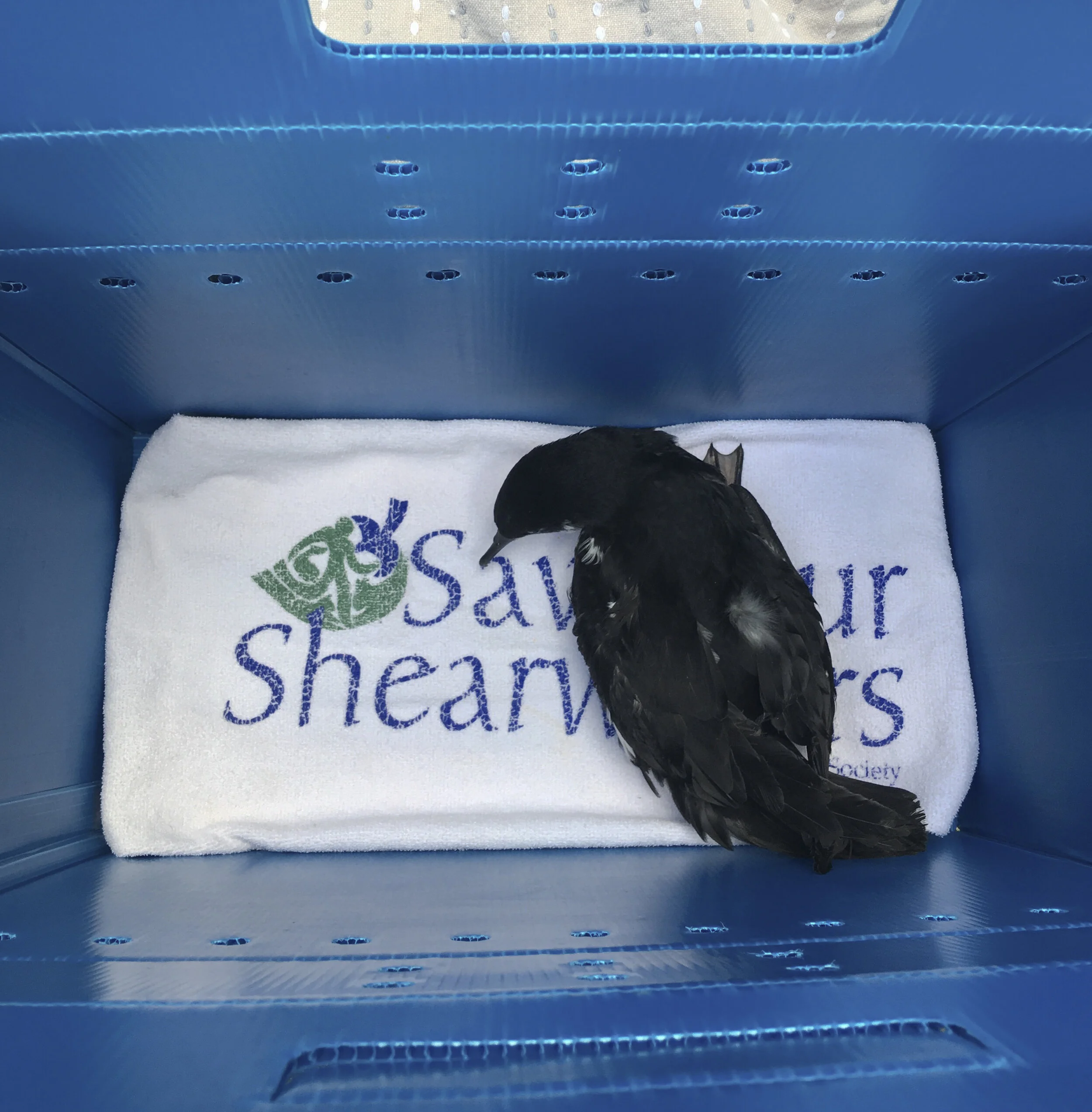 Newell's shearwater chick in transport box. Photo: Hob Osterlund