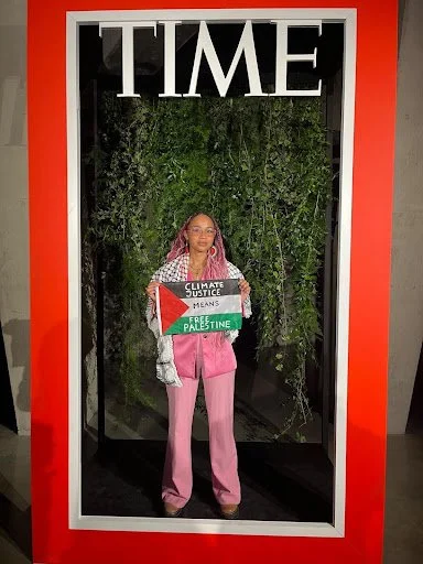 I say this quote to the man I’ve just met, here at the TIME Earth Awards (where I’ve just been told off for bringing a Palestinian flag onto the red carpet). Andrew is seated next to me, and we’re discussing the state of the world and what we need to do about it in the time between the different awardees’ speeches. “It’s a quote from Valarie Kaur’s work that I find useful in these times. If we choose to see the darkness we are in as a womb rather than a tomb, our actions can move us all towards new life rather than collapsing into death and defeat”, I continue. Andrew, who has been working in climate philanthropy for longer than I’ve been on this Earth, seems genuinely moved by this and turns to repeat the quote to his adult daughter and speedily writes it down on a piece of paper he has in his suit jacket.