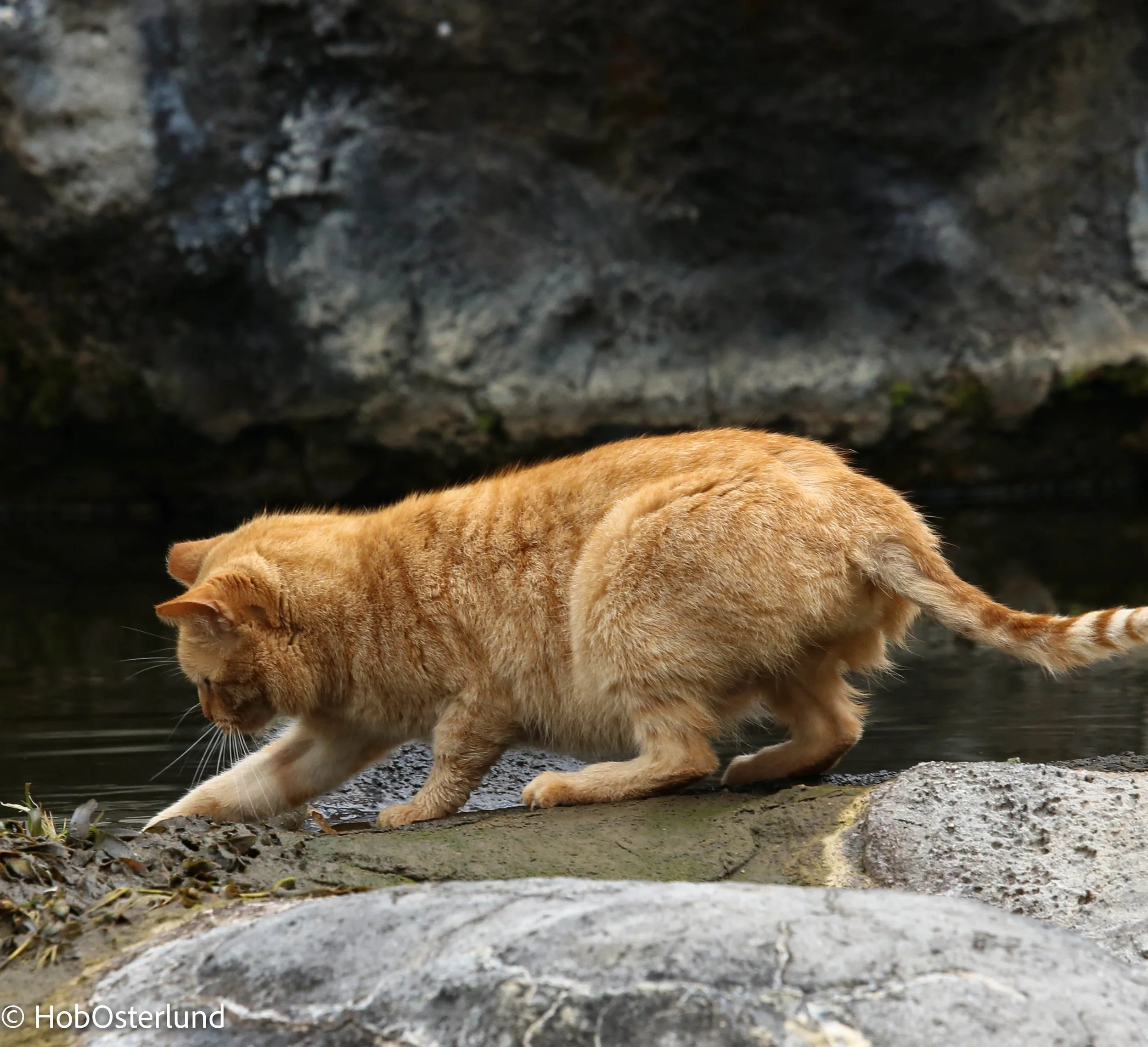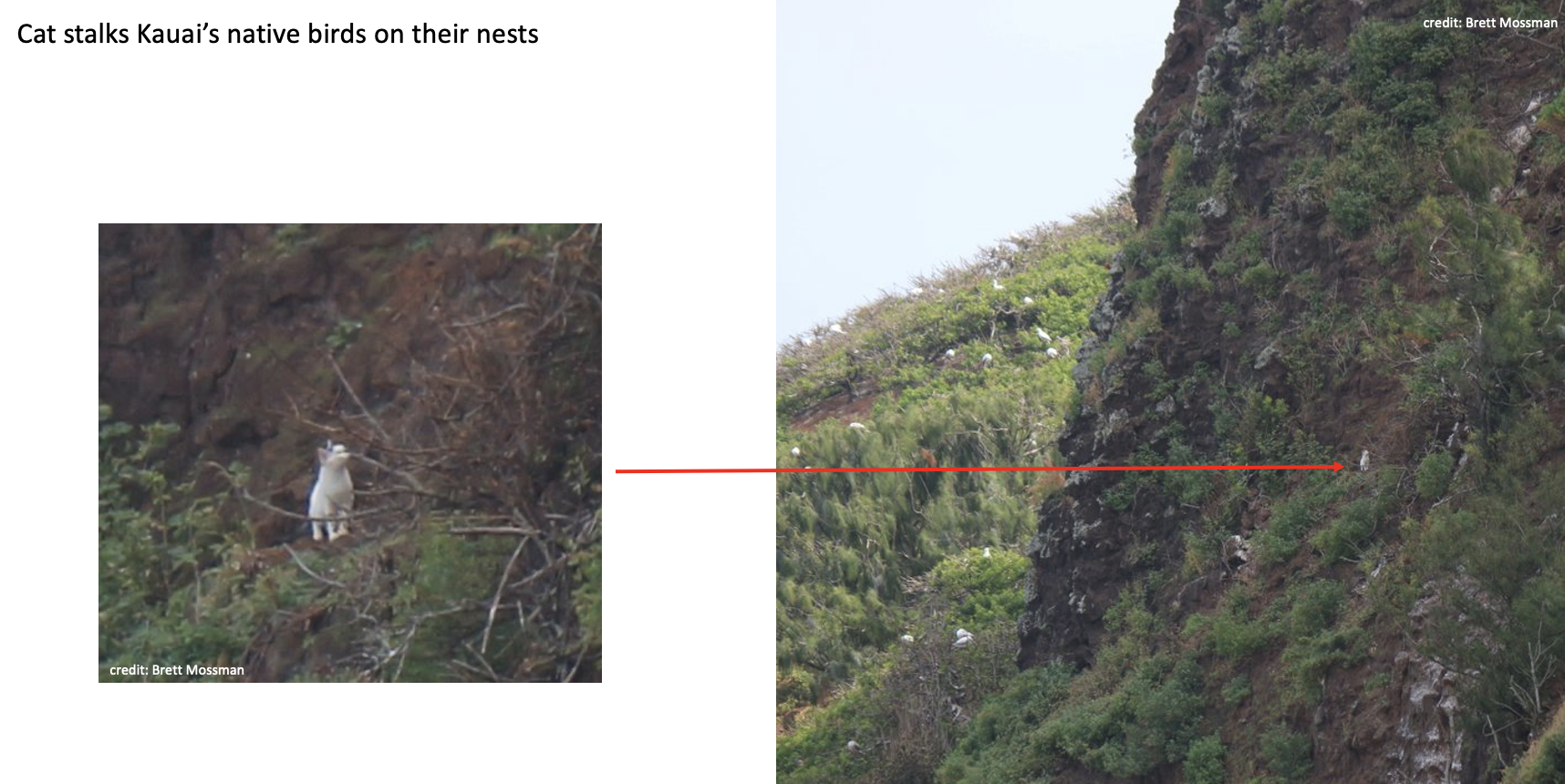 Cat on cliffside hunting in seabird nesting colony. Photo ©Brett Mossman