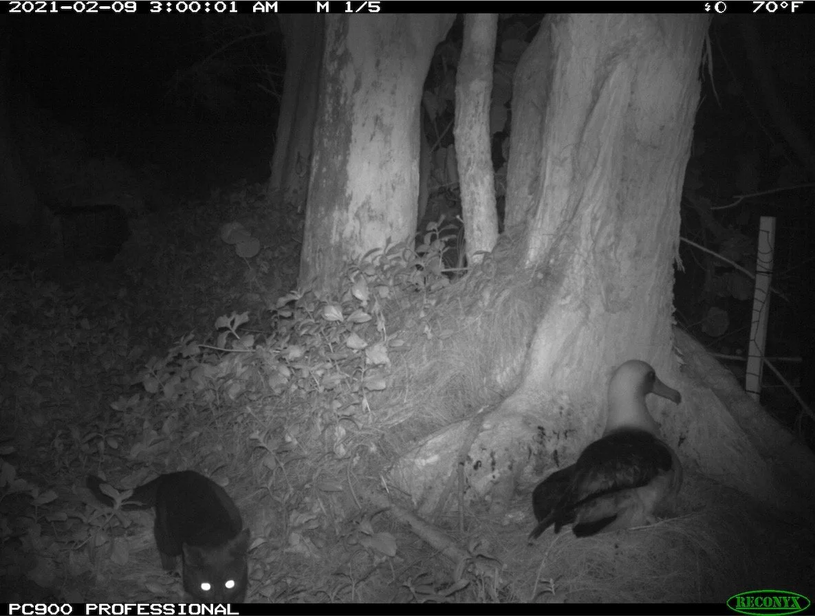 On Kauai, predation by feral cats is particularly tragic. Here we have a good number of endemic species—meaning they exist nowhere else in the world. Some of these populations are down down to approximately one thousand individuals, so any death inflicted by any invasive predator is a big loss. Hanalei National Wildlife Refuge, which protects five species of endangered wetland birds, counted 252 deaths from cat predation in a two-year period. Among Mōlī (Laysan albatross), thirteen chicks were killed in the first week of hatch alone—represent half the nests in that colony.