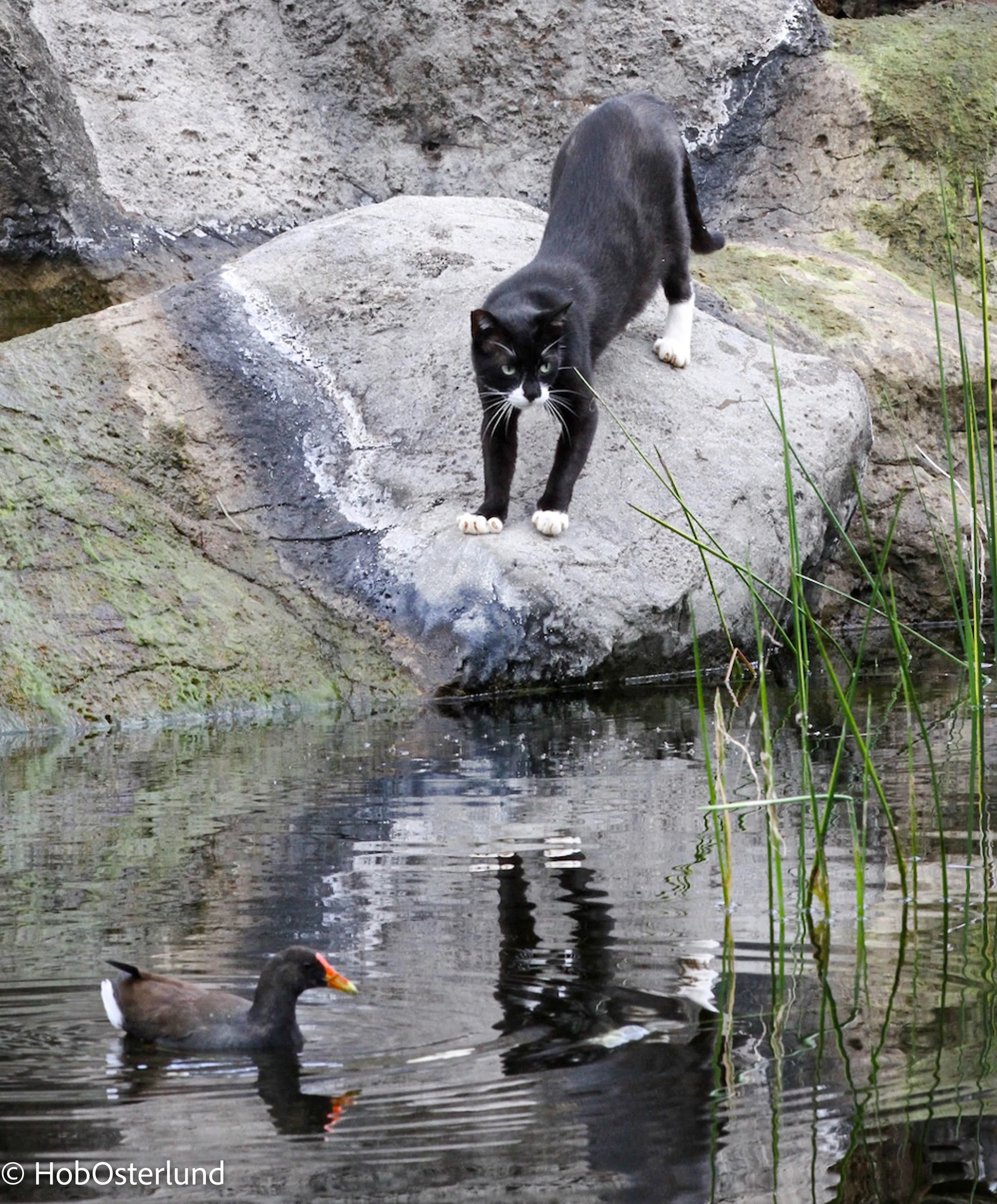 Homeless cat stalks an endangered Hawaiian gallinule. Photo ©Hob Osterlund