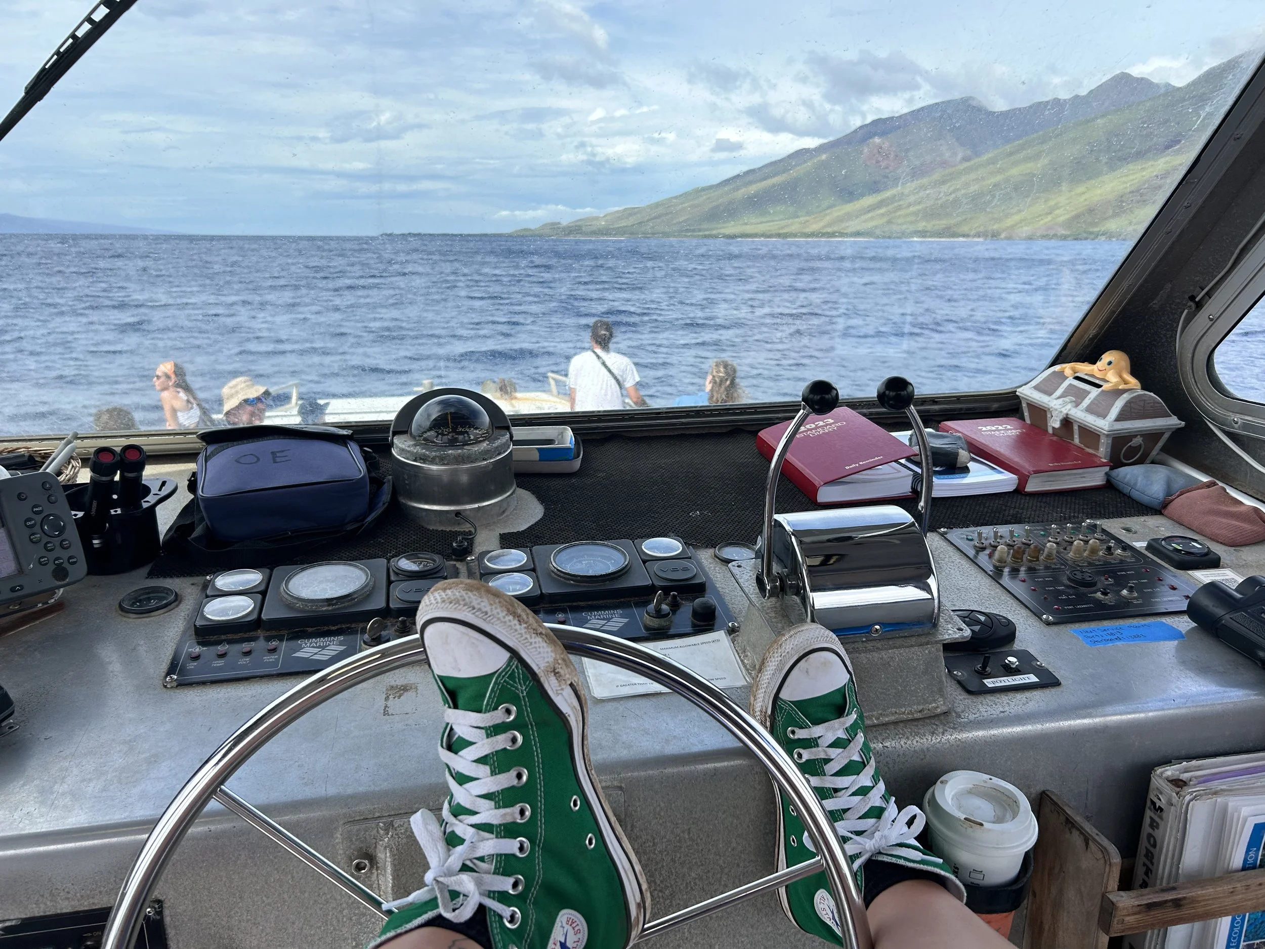At the helm of Ocean Discovery, Lāhainā HI. ©Katlyn Taylor
