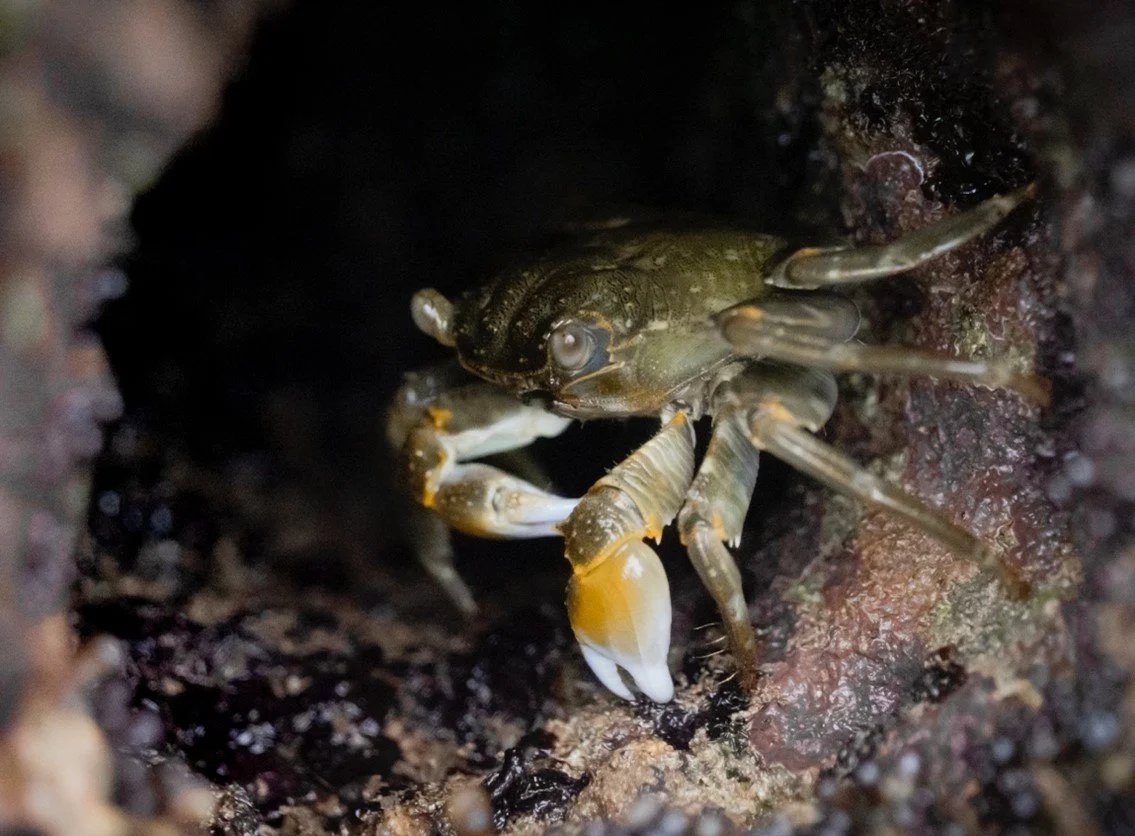 A cautious pleated rock crab (Pachygrapsus plicatus) cowers in a burrow. Though vervet monkeys do not seem to target this prey species, it is one of the crab species found within Kiwayu’s intertidal community. ©Alex Chege