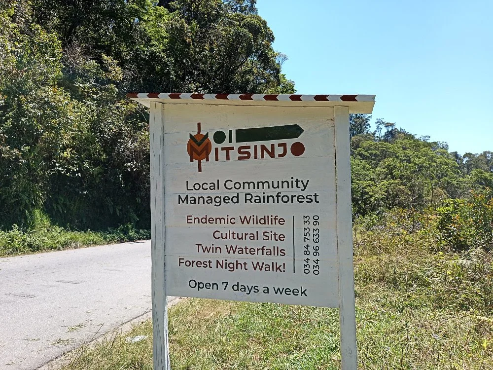 A sign that the VOI Mitsinjo managed rainforest, which is adjacent to the Ranomafana National Park, is open to tourists and other visitors. A few months prior, a letter was delivered by the leaders of the local community organization at the National Park office, making the opening official. The Ambatolahidimy forest has had some visitors since, but there was also a need to advertise the site. The leaders asked if I could make a sign to invite visitors in. I gladly agreed.