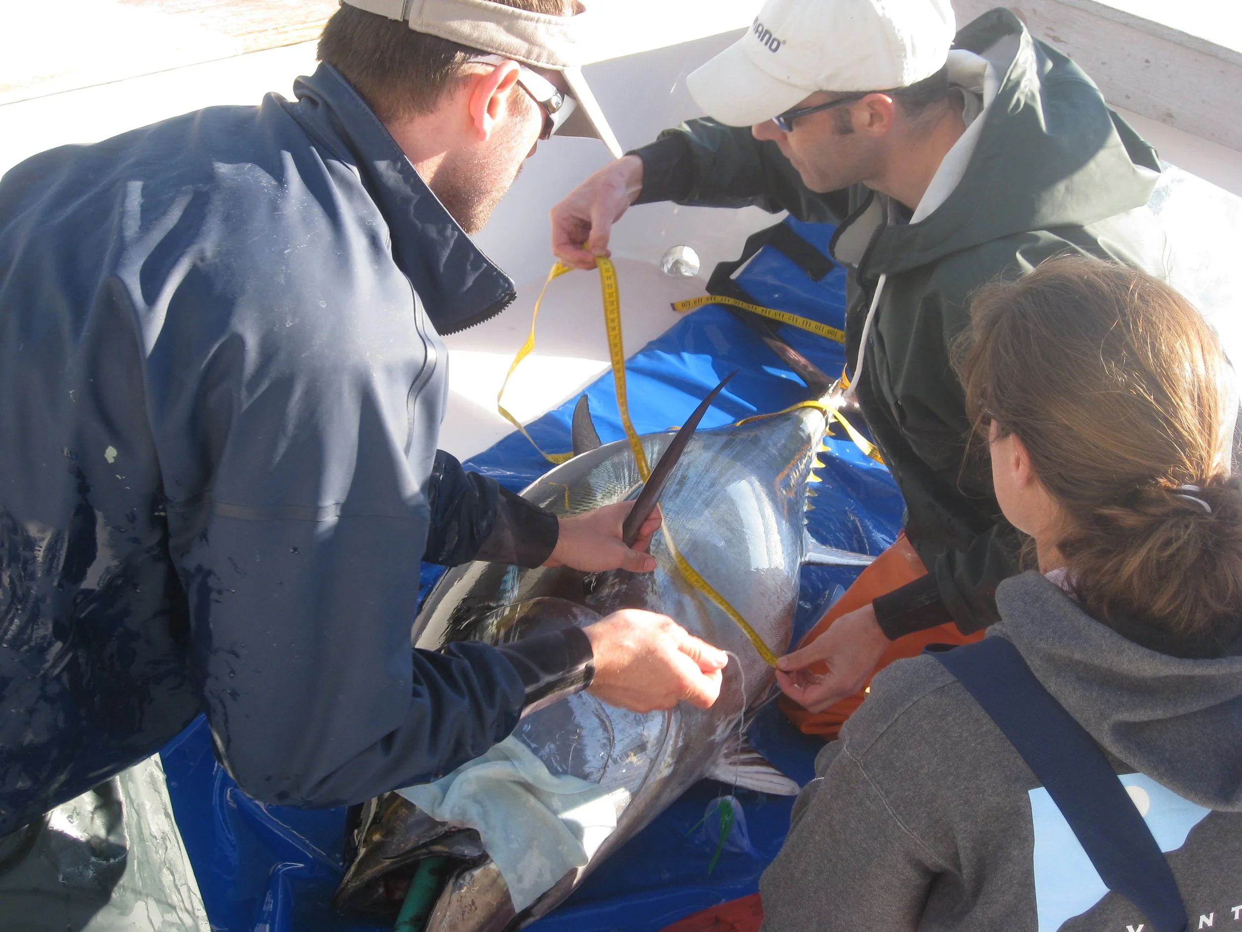 scientists measure and tag a bluefin tuna before release back into coastal US waters. © Paul Greenberg