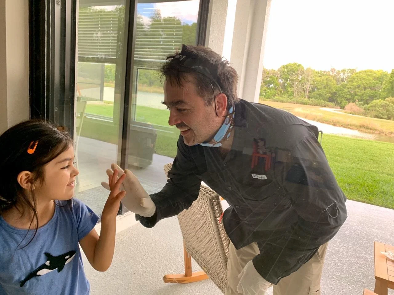After weeks of separation due to travel circumstances related to COVID-19, photographer Kike Calvo reunites with his 4-year-old daughter. It is the beginning of a 14-day preventive quarantine in which they will only see each other through a glass window, including her fifth birthday celebration. Photo: Vivienne Caballero