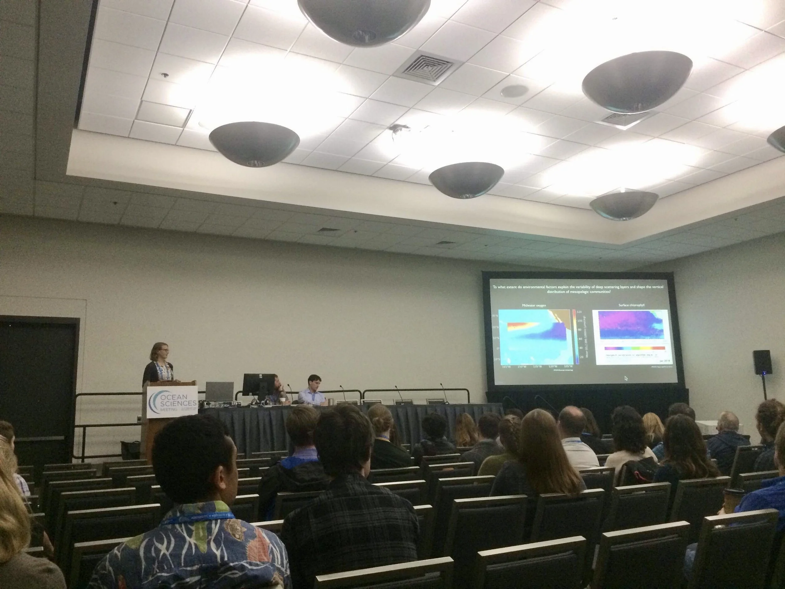 I was invited to give a talk about my research that explores the ecology of deep-ocean animals in a session focused on new methods and discoveries in the deep ocean. During this presentation, I discussed the major significance of deep-sea animal communities (particularly small fish, squid, and crustaceans) in supporting open-ocean ecosystems, how we are using new techniques to study their behavior, and how they may be threatened by impending deep-sea mining activities across a massive region in the eastern Central Pacific Ocean (the Clarion-Clipperton Zone). The broader scientific community (and general public) do not yet seem fully aware of deep-sea mining’s potentially large-scale impacts, and my talk provided a new angle on previously overlooked deep-ocean ecosystems that was well received by fellow oceanographers at this meeting.