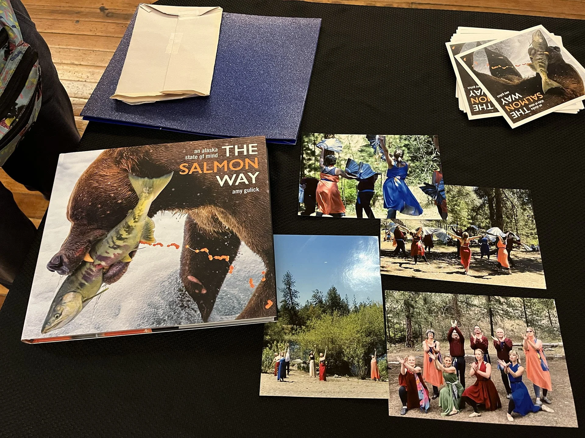 She spread photographs on a table. Photographs of dancers adorned in the deep spawning colors of salmon—red, green, blue, orange. Dancers along a river celebrating the salmon that once returned there. Dancers remembering a salmon-filled past and hoping for a salmon-filled future.