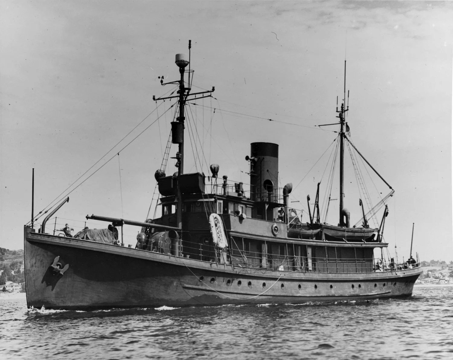 A photograph of the USS Jasper, circa 1945. Courtesy of Ted Stone, 1977. U.S. Navy photo NH 86368