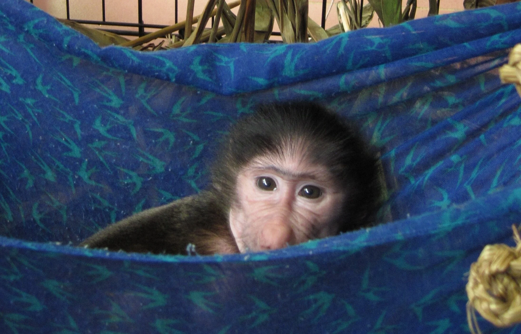 In the night, I’ll bottle feed Sunshine several times through his cage door. Sometimes, he won’t want to go back to sleep alone, since he’d typically be enveloped by his mother. That’s when I have to muster up some tough love because I’m neither his mother nor a baboon, so it’ll be less traumatic for him in the long run if he doesn’t attach too strongly to me. I poke my fingers through his cage, and Sunshine will fall asleep, either pressed against them or sucking on one, hungry for that innate primal contact.