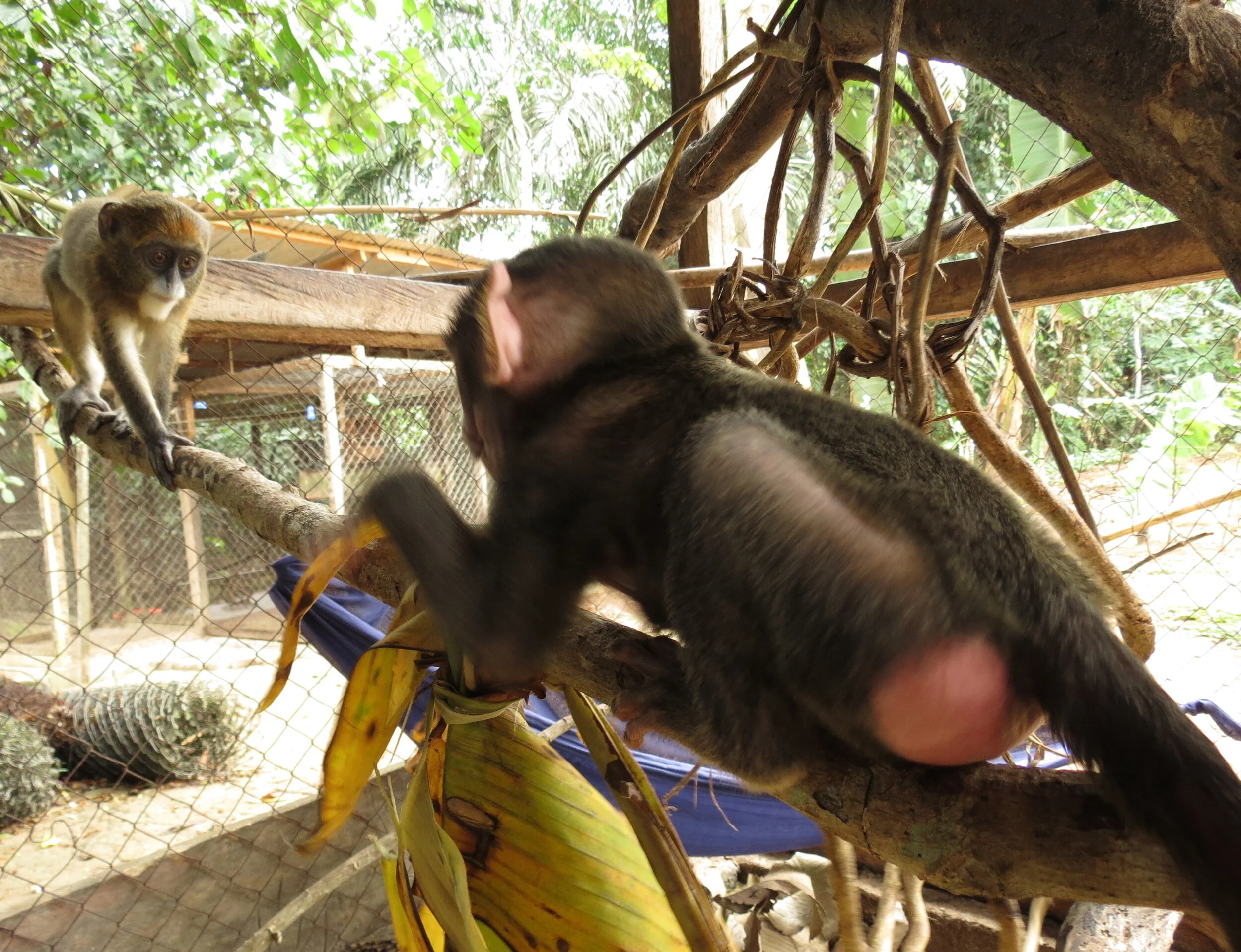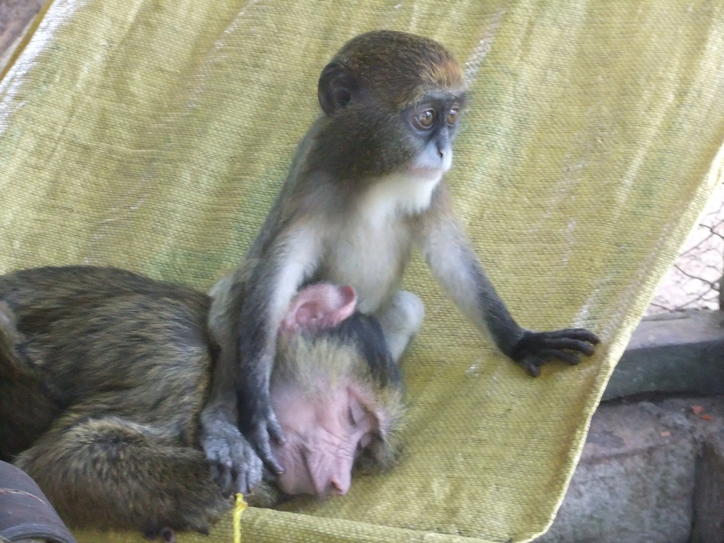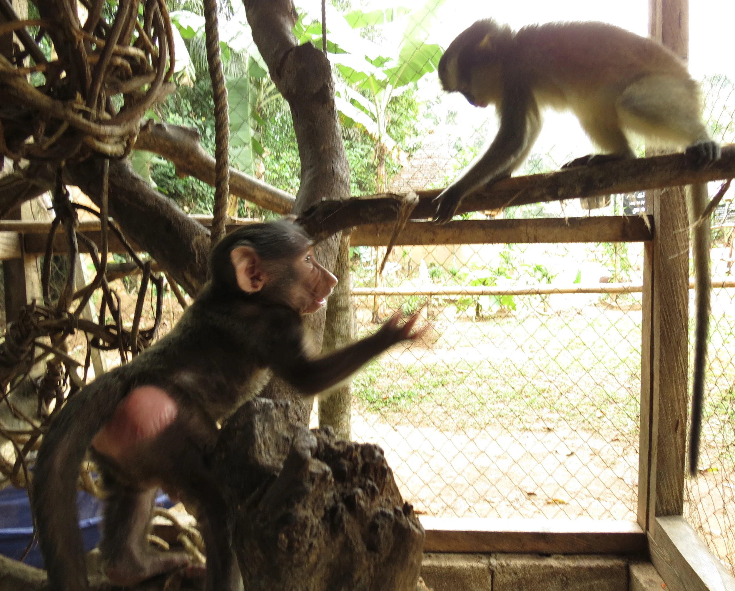 His three-month quarantine period with me completed, Sunshine the baby baboon is ready—more than ready—to meet his first monkey friends. Abida and Nunu are young monkeys who, when they’re big enough, will join a large group of various guenon monkey species in their lush forested sanctuary enclosure. Abida is a male De Brazza’s, distinguished by a silky cream-colored beard (which even females have) and a low flat vocalization that sounds remarkably like a duck. Nunu is a sweet-natured female crowned guenon with a distinctive mohawk and a soft lilting bird-like chirp. When they’d been introduced, Nunu was intimidated, but by the second day they were inseparable. Abida and Nunu are older than Sunshine (who’s now about six months), but they’re half his size.