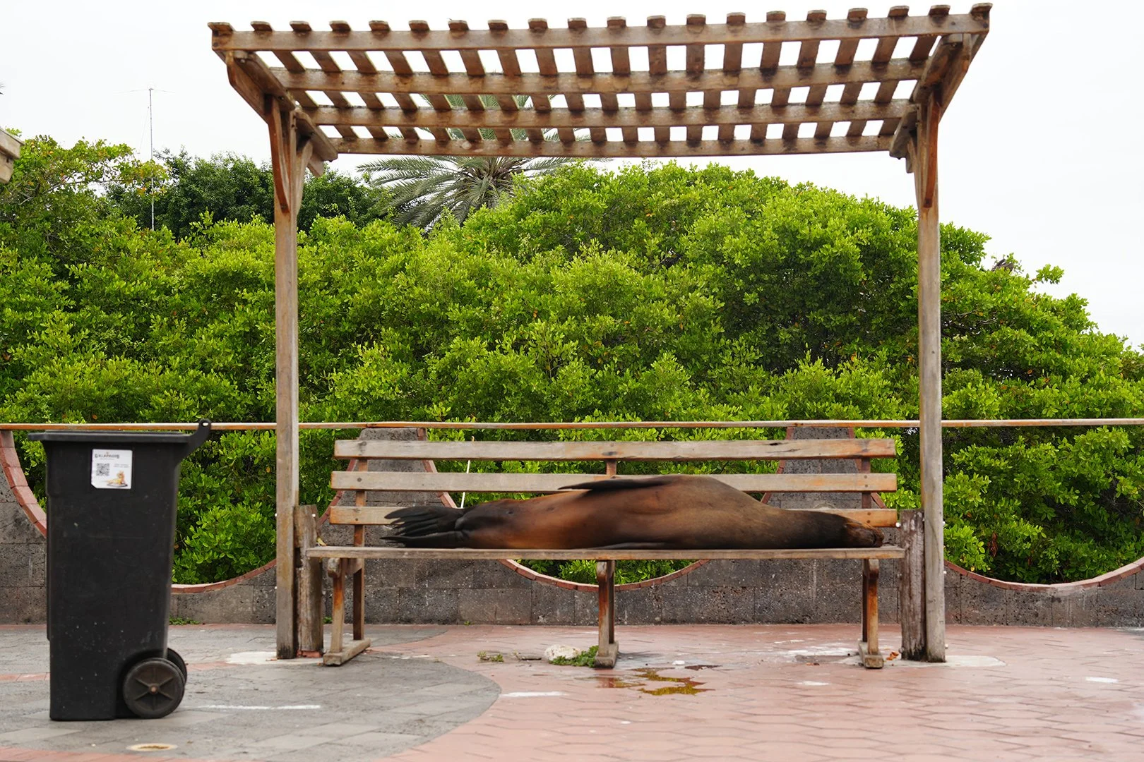 A Galápagos sea lion (Zalophus wollebaeki), and endangered species on the IUCN Red List, snoozes on a public bench at Puerto Ayora, Santa Cruz. ©Marlowe Starling