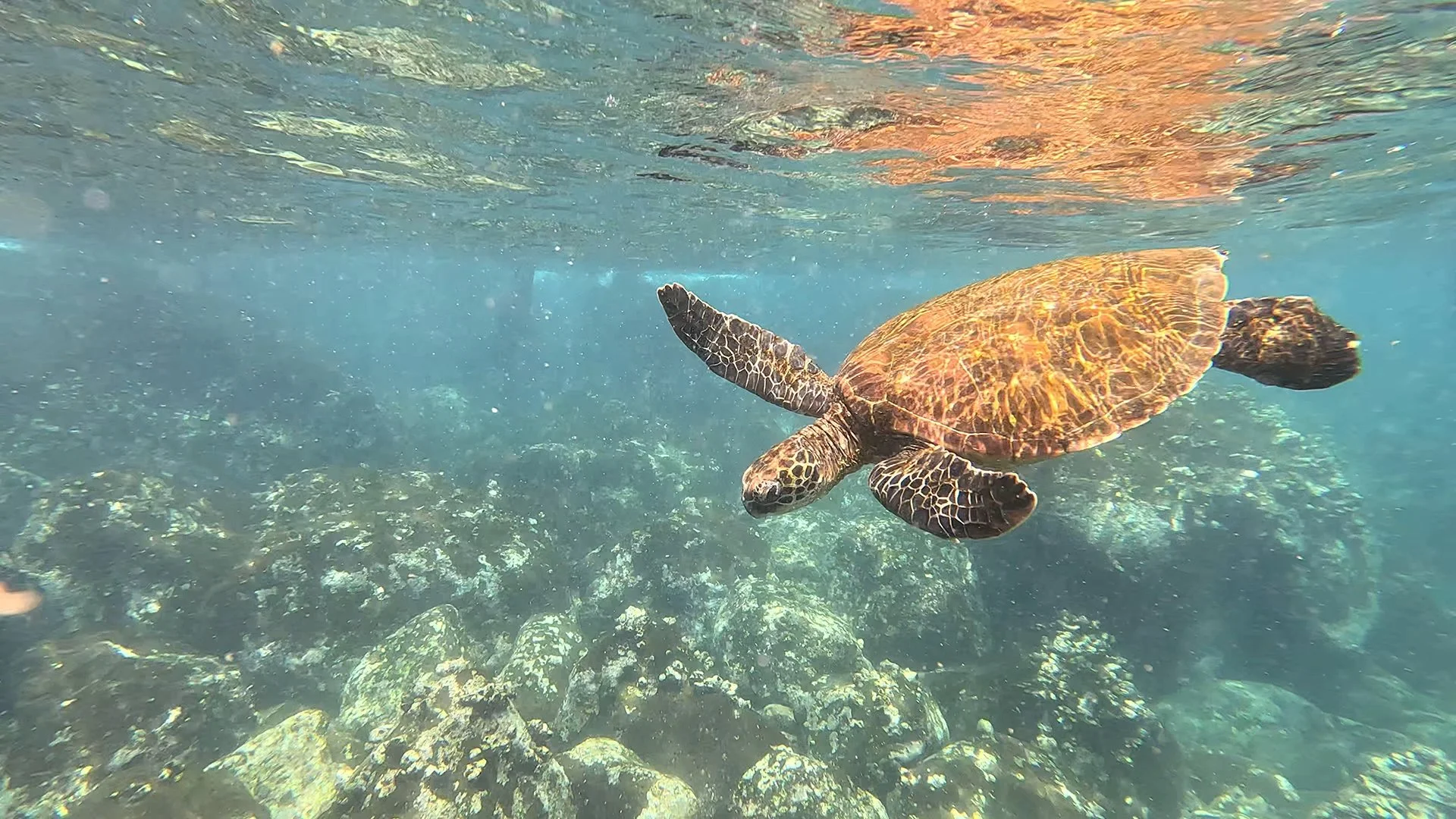A green sea turtle floats through turquoise waters off the coast of Santa Fe island. ©Marlowe Starling