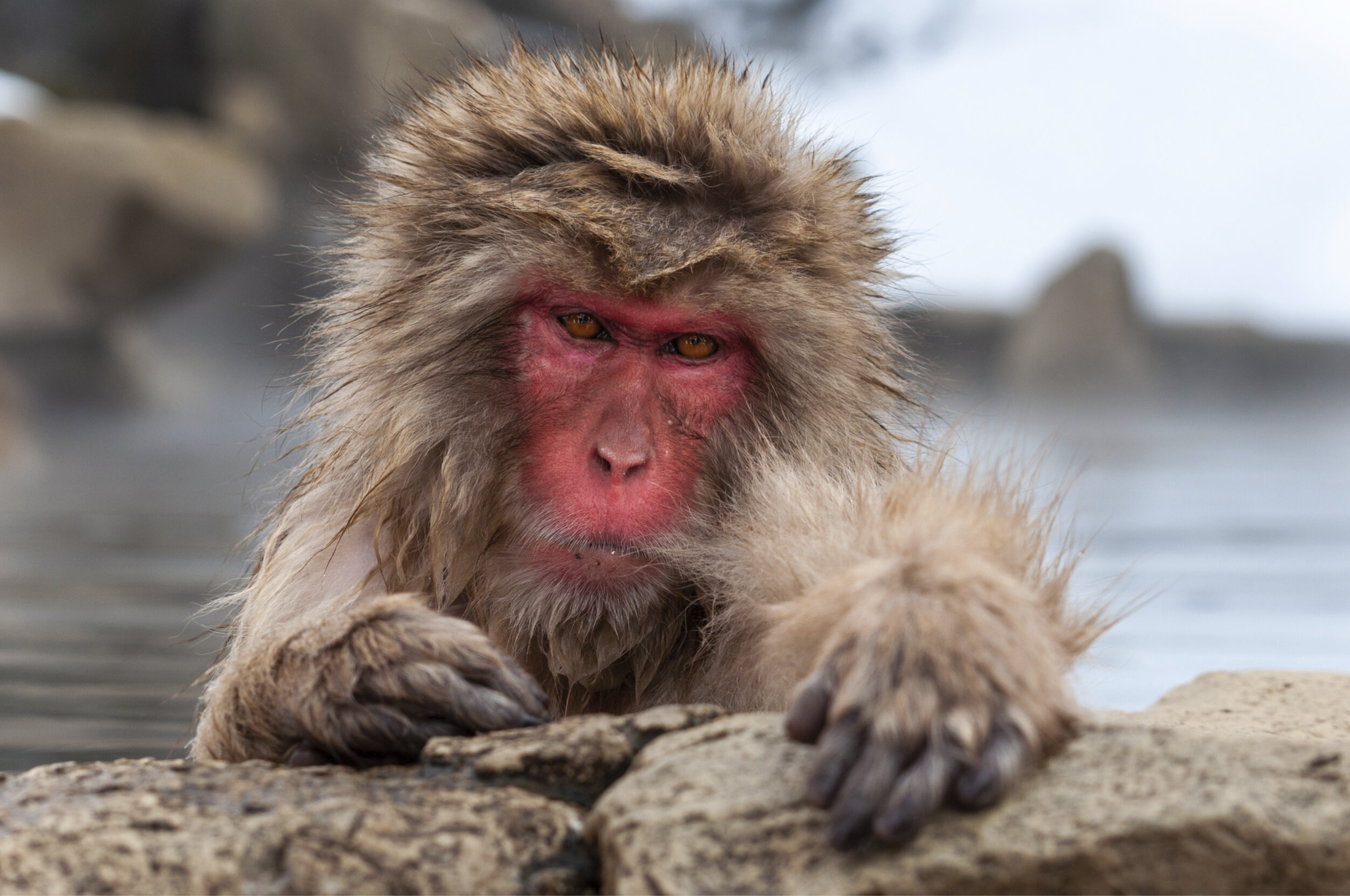 A Japanese Macaque (Macaca fuscata) warms up in hot springs at Jigokudani, Japan. Photo courtesy of wildlife photographer ©Moana Ghiandoni.