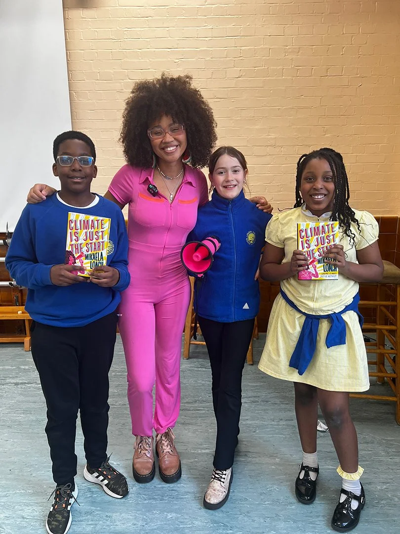 Mikaela Loach and students from the Loach Class in London with her new book Climate Is Just The Start. ©Mikaela Loach